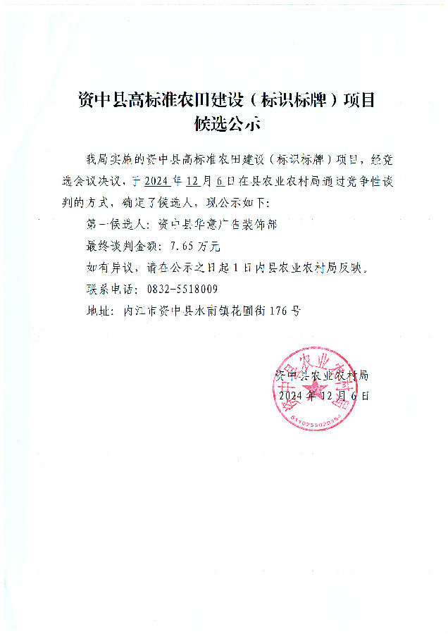 资中县高标准农田建设(标识标牌)项目候选公示