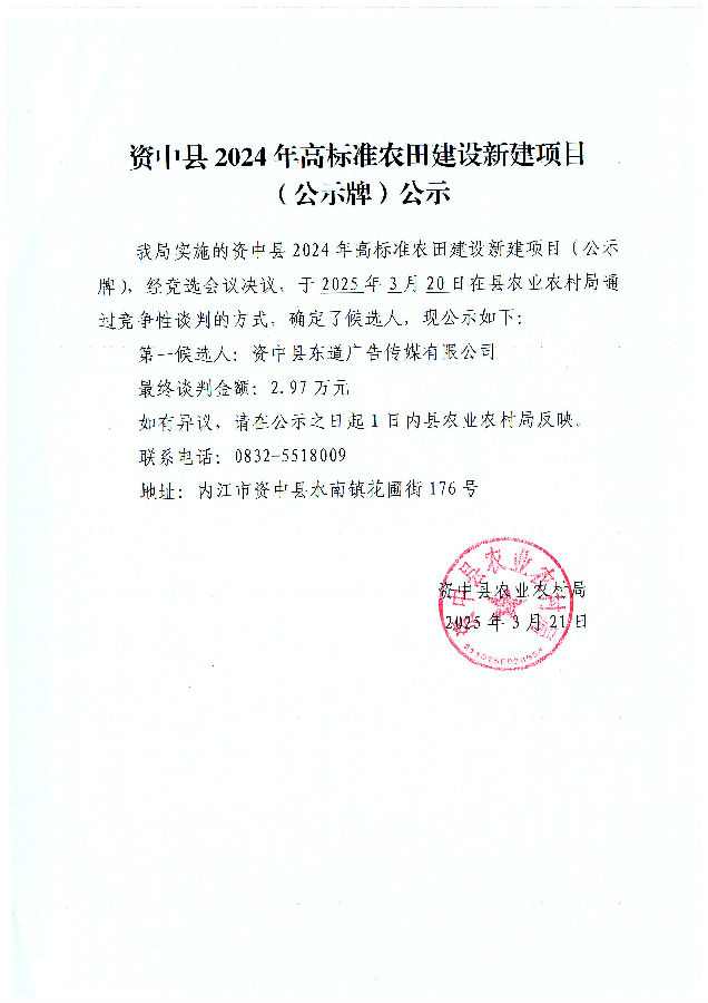 资中县2024年高标准农田建设新建项目(公示牌)公示