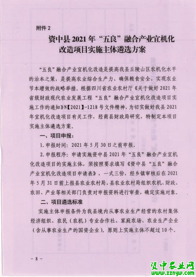 五、实施主体:实施主体申报条件为我县境内从事农业生产经营的农村集体经济组织、农民(农机)专业合作社、家庭农场、农业生产企业(含从事农业生产的国资企业)。由实施主体向项目所在镇提出项目申请(附件1),在规定的时限内经镇审核后报县农业农村部门,联系人:陈勇,联系电话:13980211312.县上将按照《资中县2021年“五良”融合产业宜机化改造项目实施主体遴选方案》(附件2)确定承担实施任务的实施主体,原则上实施主体不超过10个。