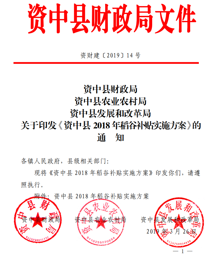 关于印发《资中县2018年稻谷补贴实施方案》的通知